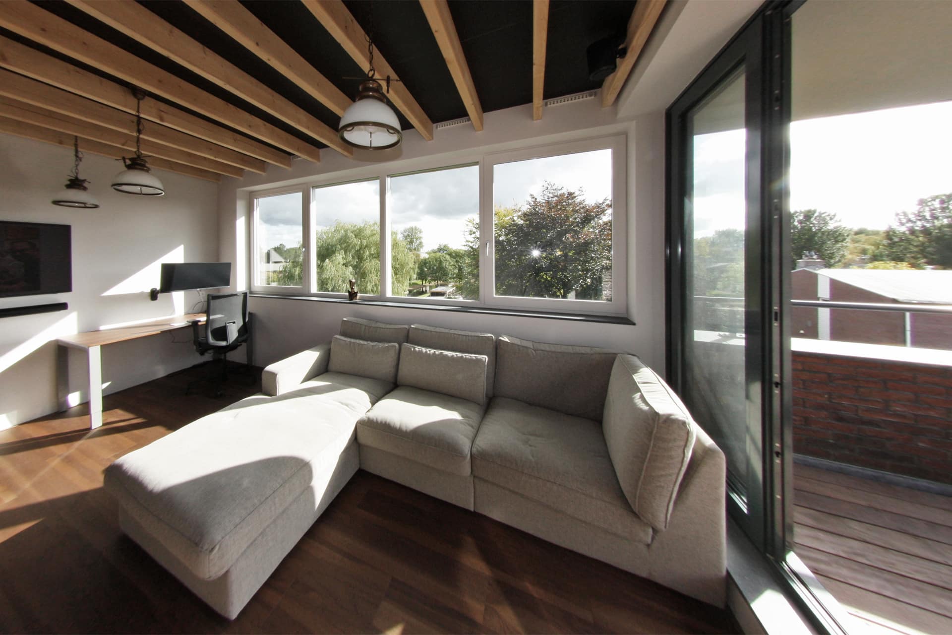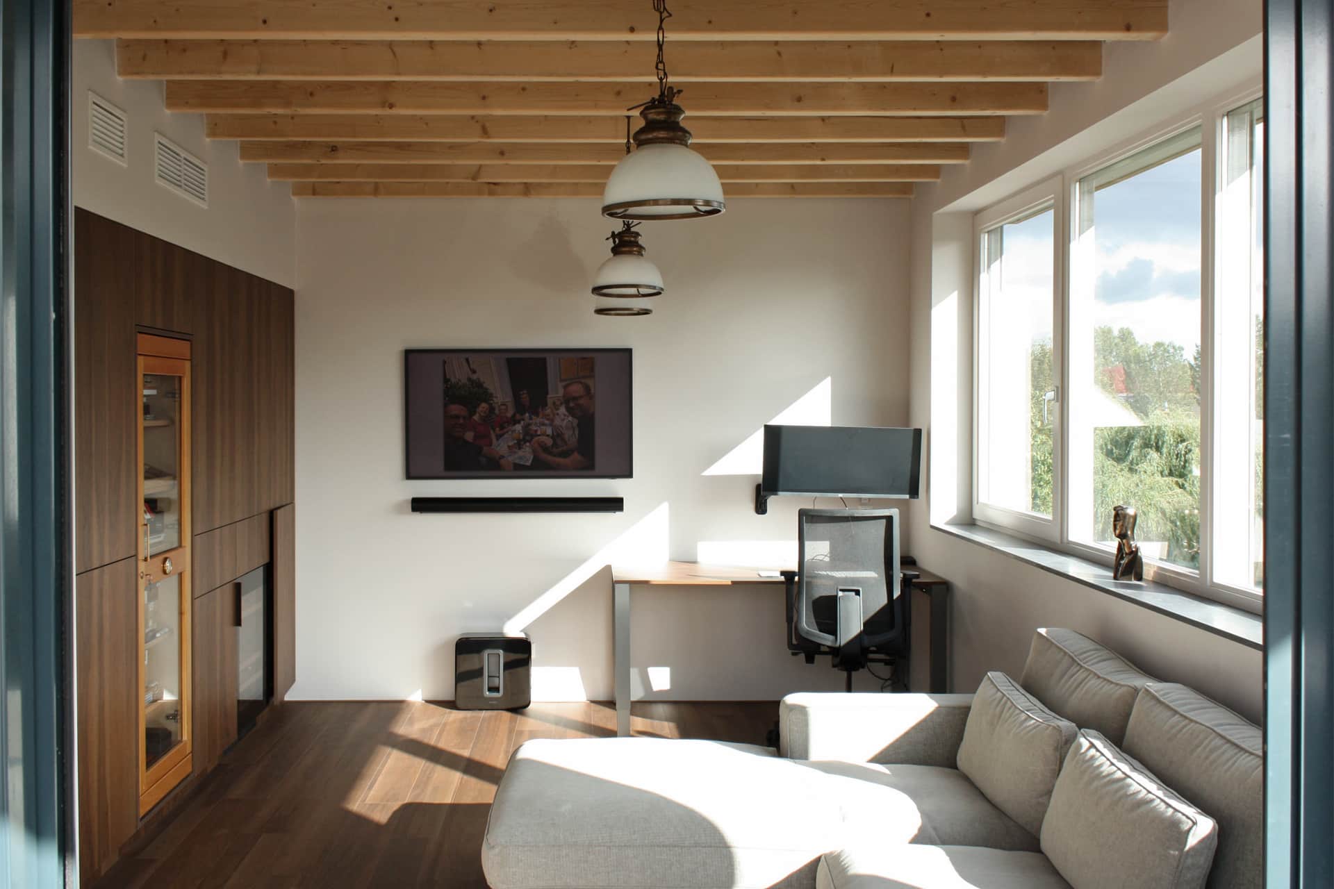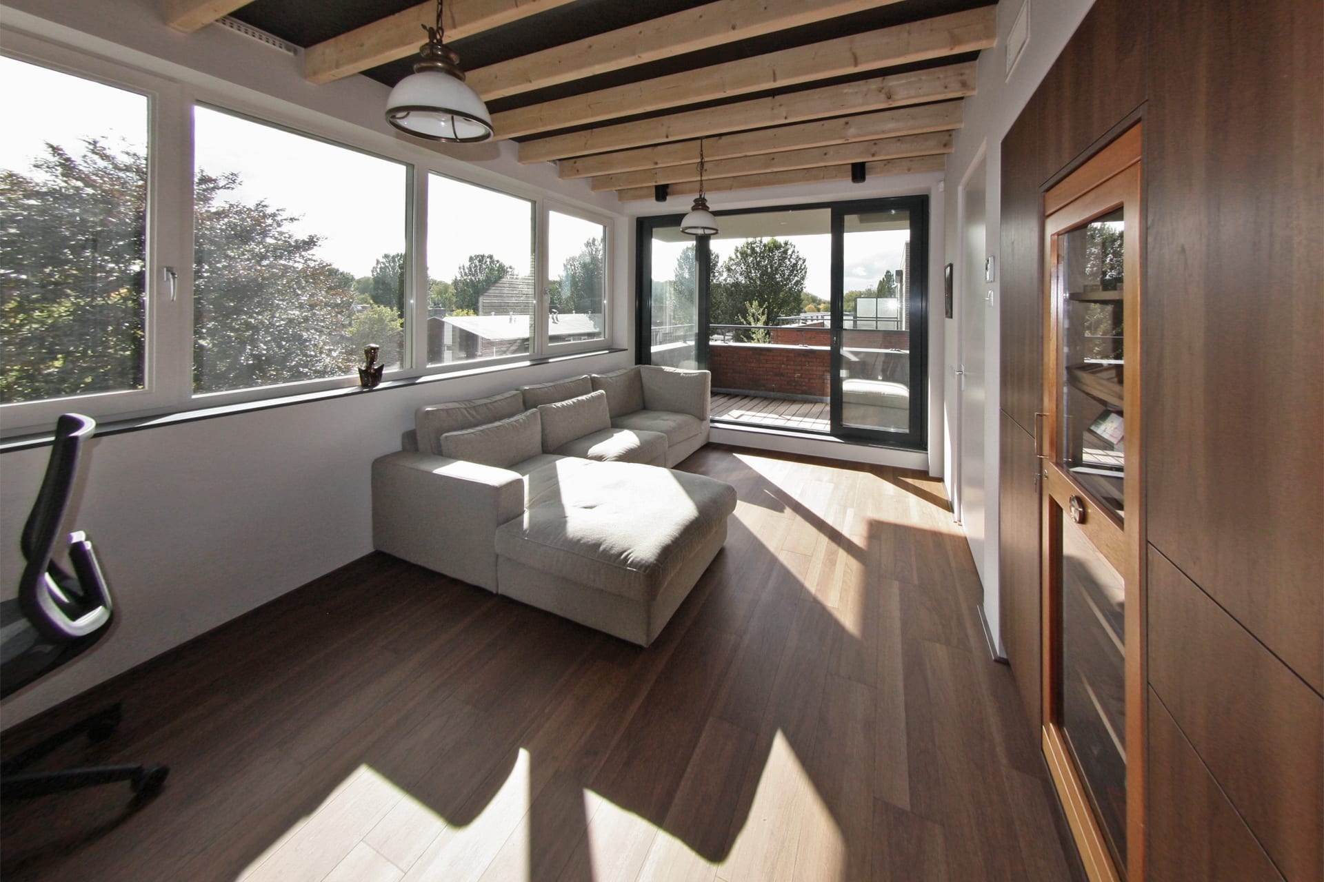 Op een ongebruikt dakterras ontwierp Umba een extra kamer om in te werken en te ontspannen. Het horizontale raam en de volledig beglaasde schuifpui bieden een wijds uitzicht, veel daglicht en optimale ventilatie. Ingebouwde screens voorkomen oververhitting en zorgen voor een aangenaam binnenklimaat.